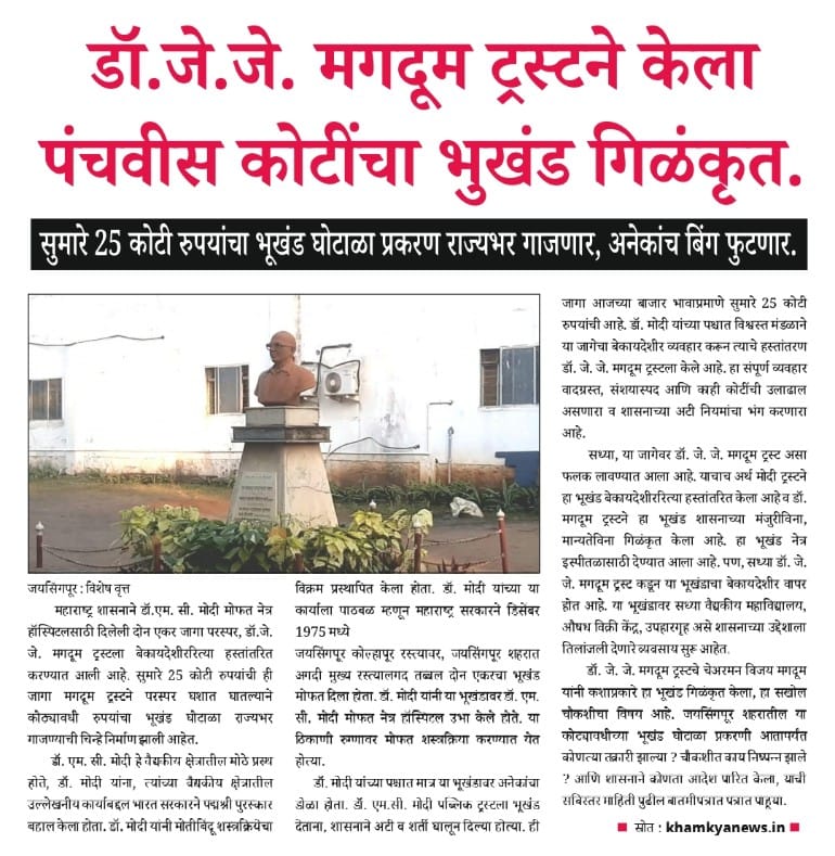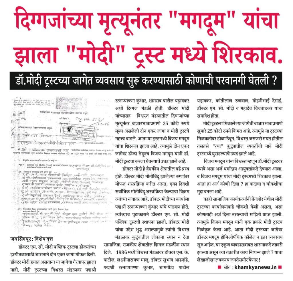 डॉक्टर एम. सी. मोदी पब्लिक ट्रस्टला डोळ्यांच्या इस्पीतळासाठी शासनाने दोन एकर जागा मोफत दिली. डॉक्टर मोदी हयात असताना या जागेचा गैरवापर झाला नाही. मोदी ट्रस्टच्या विश्वस्त मंडळावर पद्मश्री रत्नाप्पाण्णा कुंभार, शामराव पाटील यड्रावकर अशी दिग्गज मंडळी होती. डॉक्टर मोदी यांच्यासह विश्वस्त मंडळातील दिग्गजांच्या मृत्यूनंतर बाजारभावाप्रमाणे 25 कोटी रुपये मूल्य असलेली दोन एकर जागा व मोदी ट्रस्टचे महत्त्व वाढले. आता या ट्रस्टमध्ये विजय मगदूम यांचा शिरकाव झाला आहे. त्यामुळे दोन एकर जागेवर डोळा ठेवूनच विजय मगदूम यांनी डॉ. मोदी ट्रस्टचा कब्जा घेतल्याचे उघड झाले आहे.