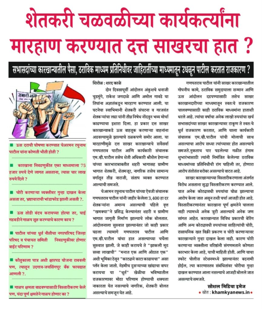 चेअरमन रघुनाथ पाटील यांच्या ऐवजी संचालक गणपतराव पाटील यांनी जाहीर केलेला 3,400 हा दर शेतकऱ्यांना अमान्य असल्याची पहिले वृत्त “खमक्या”ने प्रसिद्ध केल्यानंतर शहरी व ग्रामीण भागात जागृती निर्माण झाल्याचे लोक बोलतात. आंदोलनाला सुरुवात झाल्यानंतर जो काही प्रकार घडला त्यामागे गणपतराव पाटील आणि एम.व्ही.पाटील यांचा हात असल्याच्या चर्चेला सुरुवात झाली. जे काही करायचे ते “झाकली मूठ सव्वा लाखाची” “मनात एक आणि ओठात एक” अशी भूमिका ठेवून “काट्याने काटा काढायचा” असा प्लॅन केला जातो. नेहमीच दुसऱ्याच्या खांद्याचा वापर करायचा या “धूर्त” खेळीचा भविष्यातील राजकारणावर मोठा परिणाम होण्याची शक्यता नाकारता येत नसल्याचे नागरिक, शेतकरी बोलत असल्याचे समजून येत आहे.
