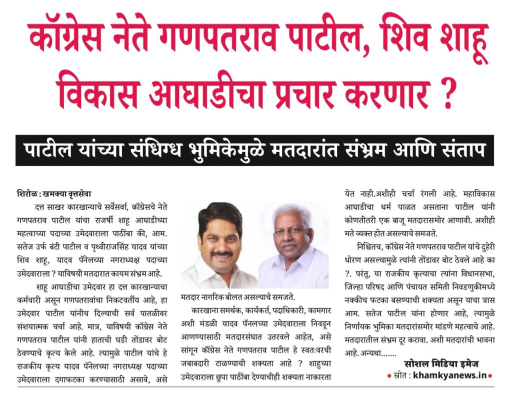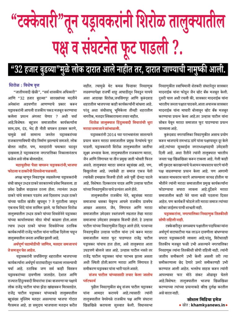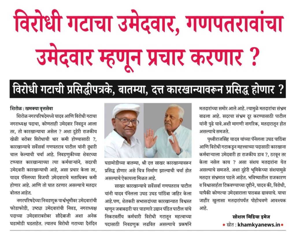 Uncategorized नगरपरिषद निवडणुकीतील भयावह वास्तव, टक्केवारीचा बाजार, ढपल्याची हाव सुटेना. editor_khamkya@outlook.com November 19, 2025 Continue Reading Previous: कॉग्रेस नेते गणपतराव पाटील, शिव शाहू विकास आघाडीचा प्रचार करणार ?Next: आम. राजेंद्र पाटील यड्रावकर यांनी आम. अशोकराव मानेंचा नाद करू नये ?. Leave a Reply Cancel replyYour email address will not be published. Required fields are marked *Comment * Name * Email * Website Save my name, email, and website in this browser for the next time I comment. खमक्या विशेष Uncategorized तरी देखिल, तहसिलदार “हेळकर” यांना “आदर्श तहसिलदार” म्हणून पुरस्कार editor_khamkya@outlook.com March 10, 2026 Uncategorized तहसीलदार व मंडलाधिकारी यांना गौण खनिज वाहतूकीवर दंड व जप्तीच्या कारवाईचे अधिकार नाहीत : हायकोर्ट editor_khamkya@outlook.com March 10, 2026 Uncategorized शिरोळचे तहसीलदार अनिलकुमार हेळकर यांचे नाव आरोपी म्हणून वगळल्याच्या गंभीर प्रकरणाची चौकशी करावी editor_khamkya@outlook.com March 8, 2026