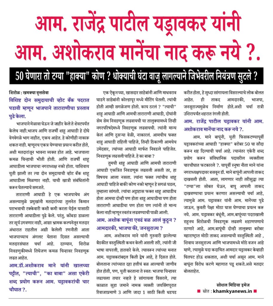 बाबांना शिरोळचे भिष्माचार्य म्हटले जाते, बाबांनी अनेक अन्याय, भ्रष्ट कारभार, हुकूमशाही पाहिली, सगळ उघड्या डोळ्यान पाहिल, पण, तोंडातून ब्र काढला नाही. प्रामाणिक राहून एकनिष्ठपणाची कास सोडली नाही. योग्य वेळ आत्यानंतर भात्यातून बाण काढून जनतेसमोर आणण्याचा निर्णय त्यांनी घेतला होता. आणि या निवडणुकीत मतदार समुदायाला साक्ष ठेवत “ब्रम्हास्त्र” डागल्याचे मतदार बोलताहेत.