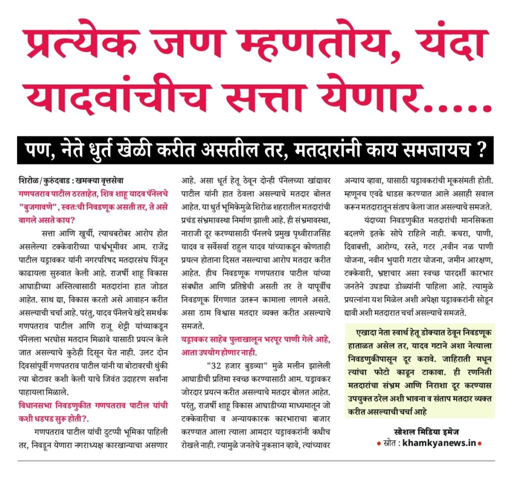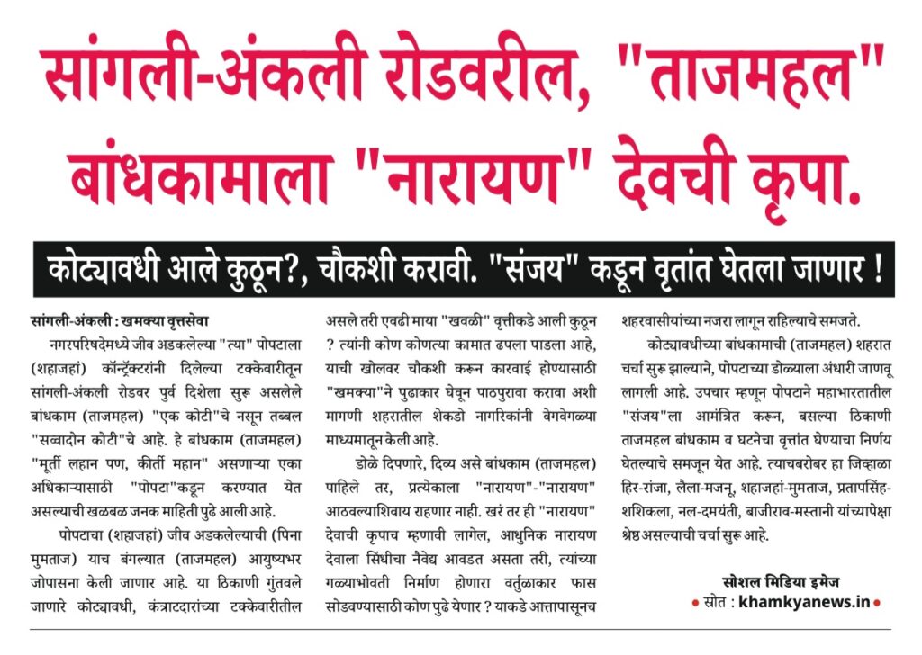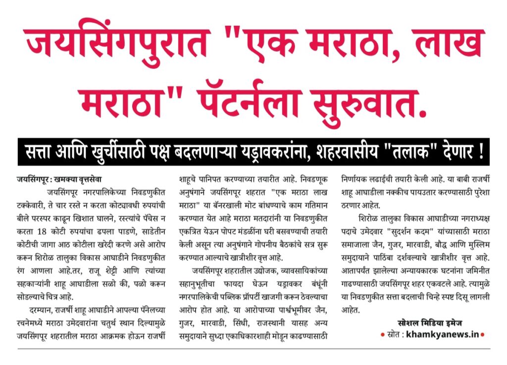 Uncategorized डोळे मिटून दुध पिणाऱ्या बोक्याच्या पाठीत काठी बसणार ! editor_khamkya@outlook.com November 24, 2025 Continue Reading Previous: प्रत्येक जण म्हणतोय, यंदा यादवांचीच सत्ता येणार…..Next: बाबांनी बदलला प्रभाग 9 चा रंग, क्लार्कचा, शिपाई होण्याचे स्वप्न होताहे भंग Leave a Reply Cancel replyYour email address will not be published. Required fields are marked *Comment * Name * Email * Website Save my name, email, and website in this browser for the next time I comment. खमक्या विशेष Uncategorized तरी देखिल, तहसिलदार “हेळकर” यांना “आदर्श तहसिलदार” म्हणून पुरस्कार editor_khamkya@outlook.com March 10, 2026 Uncategorized तहसीलदार व मंडलाधिकारी यांना गौण खनिज वाहतूकीवर दंड व जप्तीच्या कारवाईचे अधिकार नाहीत : हायकोर्ट editor_khamkya@outlook.com March 10, 2026 Uncategorized शिरोळचे तहसीलदार अनिलकुमार हेळकर यांचे नाव आरोपी म्हणून वगळल्याच्या गंभीर प्रकरणाची चौकशी करावी editor_khamkya@outlook.com March 8, 2026
