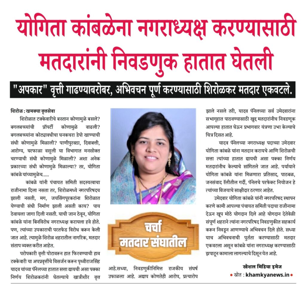 आपले मत वाया घालवू नका, योग्य उमेदवारालाच द्या.शिरोळ नगरपरिषदेच्या निवडणुकीत आम.बंटी पाटील, मा.खा. राजू शेट्टी आणि दत्त साखरचे सर्वेसर्वा गणपतराव पाटील यांनी यादव पॅनेलला उघड पाठबळ देत इरादा स्पष्ट केला असून नगरपरिषदेला “घुस” लागता कामा नये, यासाठी खास गोपनिय बंदोबस्त केल्याची दबक्या आवाजात चर्चा आहे.