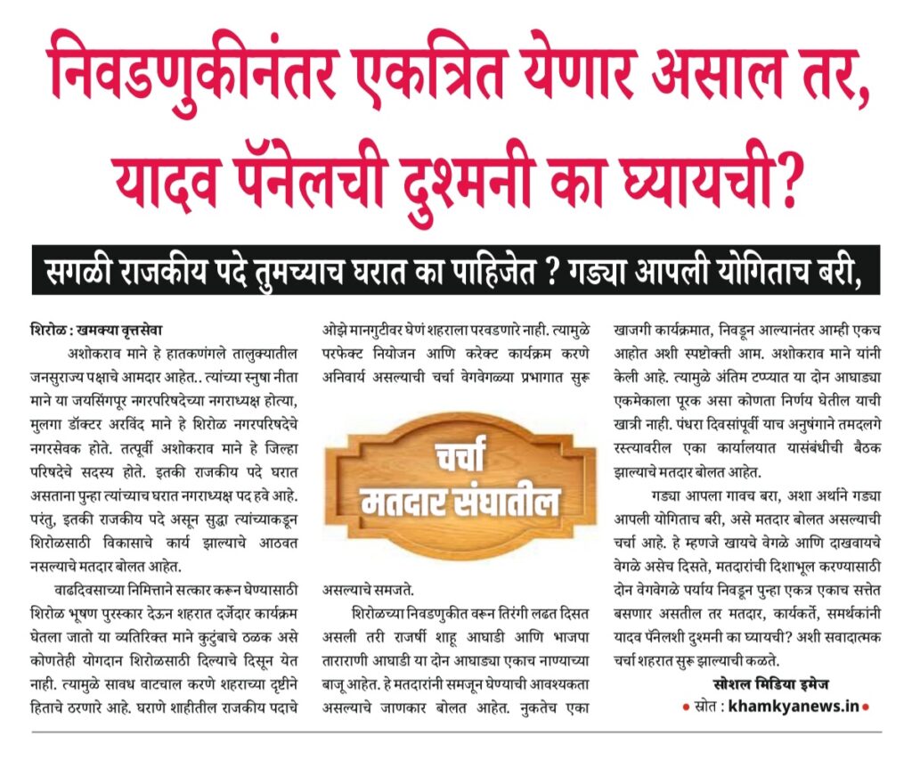 गड्या आपला गावच बरा, अशा अर्थाने गड्या आपली योगिताच बरी, असे मतदार बोलत असल्याची चर्चा आहे. हे म्हणजे खायचे वेगळे आणि दाखवायचे वेगळे असेच दिसते, मतदारांची दिशाभूल करण्यासाठी दोन वेगवेगळे पर्याय निवडून पुन्हा एकत्र एकाच सत्तेत बसणार असतील तर मतदार, कार्यकर्ते, समर्थकांनी यादव पॅनेलशी दुश्मनी काय घ्यायची? अशी सवादात्मक चर्चा शहरात सुरू झाल्याची कळते.