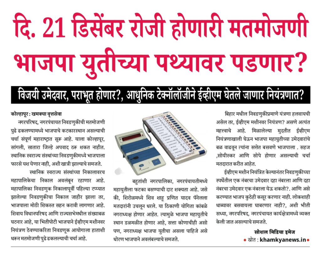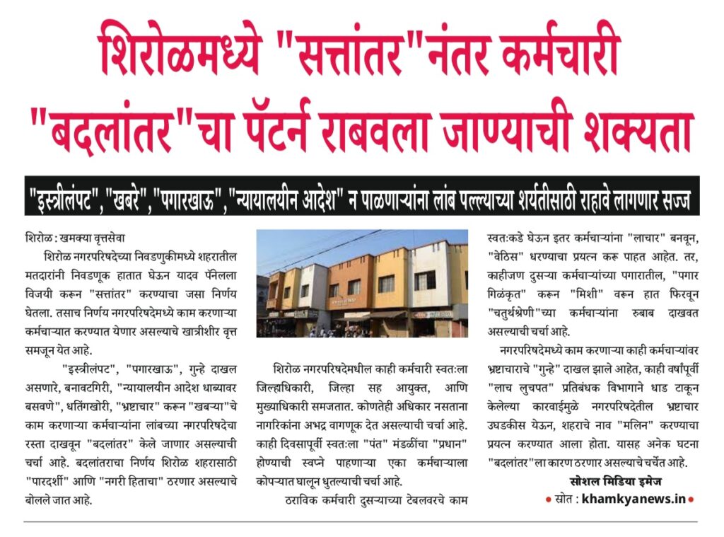 Uncategorized शिरोळ नगरपरिषद, मतमोजणी, झाकणझुल्या महामाऊली आणि “पुढारपण”ची गुगली सो.मि.इमेज editor_khamkya@outlook.com December 6, 2025 Continue Reading Previous: दि. 21 डिसेंबर रोजी होणारी मतमोजणी भाजपा युतीच्या पथ्यावर पडणार?Next: ग्रोबझ फसवणूक प्रकरण : खोटे बोललात, तर तुम्हीच अडचणीत याल ; न्या. शिवकुमार दिगे Leave a Reply Cancel replyYour email address will not be published. Required fields are marked *Comment * Name * Email * Website Save my name, email, and website in this browser for the next time I comment. खमक्या विशेष Uncategorized तहसीलदार व मंडलाधिकारी यांना गौण खनिज वाहतूकीवर दंड व जप्तीच्या कारवाईचे अधिकार नाहीत : हायकोर्ट editor_khamkya@outlook.com March 10, 2026 Uncategorized शिरोळचे तहसीलदार अनिलकुमार हेळकर यांचे नाव आरोपी म्हणून वगळल्याच्या गंभीर प्रकरणाची चौकशी करावी editor_khamkya@outlook.com March 8, 2026 Uncategorized उंचीने बाटुंगी आणि वृत्तीने बुटुंगी, पटवर्धनांच्या मंडळातील “लेडी सिंघम” कोण ? editor_khamkya@outlook.com March 6, 2026