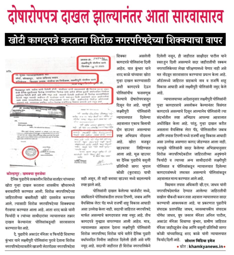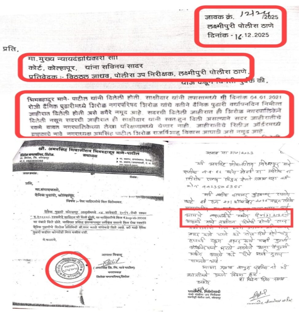 न्यायालयाच्या आदेशानुसार लक्ष्मीपुरी पोलिसांनी पुन्हा कागदपत्राचे अवलोकन केल्यानंतर विसंगत कागदपत्रे असल्याचे दिसून आल्यानेच पोलिसांनी त्या संदर्भातील स्पष्ट अभिप्राय आपल्या अहवालात अधोरेखित केला आहे. परंतु, गुन्हा दाखल करीत असताना वैयक्तिक लेटर पॅड, पोलिसातील जबाब आणि तपास टिपणी मध्ये राजर्षी शाहू विकास आघाडी असा उल्लेख असणारा कागद जोडण्यात आला नाही. त्यामुळे पोलिसांनी सादर केलेल्या अभिप्रायानुसार शिरोळ नगरपरिषदेकडील जाहिरातीच्या अनुषंगाने फिर्यादी व त्याच्या अन्य साथीदारांनी लक्ष्मीपूरी पोलिसात व पोलिसांकडून न्यायालयात दिलेल्या कागदपत्रांमध्ये तफावत असल्याचे पोलिसांकडून अहवालात मान्य करण्यात आले आहे.