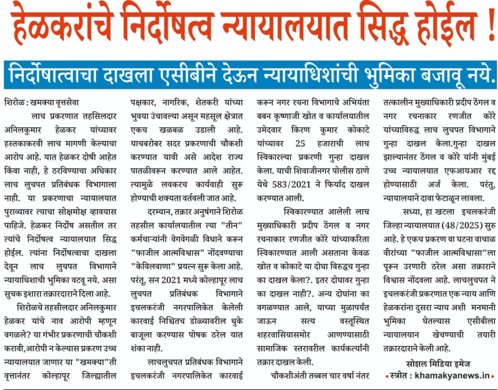 सध्या, हा खटला इचलकरंजी जिल्हा न्यायालयात (48/2025) सुरु आहे. हे एकच प्रकरण वा घटना वाचाळ वीरांच्या “फाजील आत्मविश्वासा”ला पूरून उरणारी ठरेल असा तक्राराने विश्वास नोंदवला आहे. लाचलुचपत ने इचलकरंजी प्रकरणात एक न्याय आणि हेळकरांना दुसरा न्याय अशी मनमानी भुमिका घेतल्यास एसीबीला न्यायालयान खेचण्याची तयारी तक्रारदाराने केली आहे.