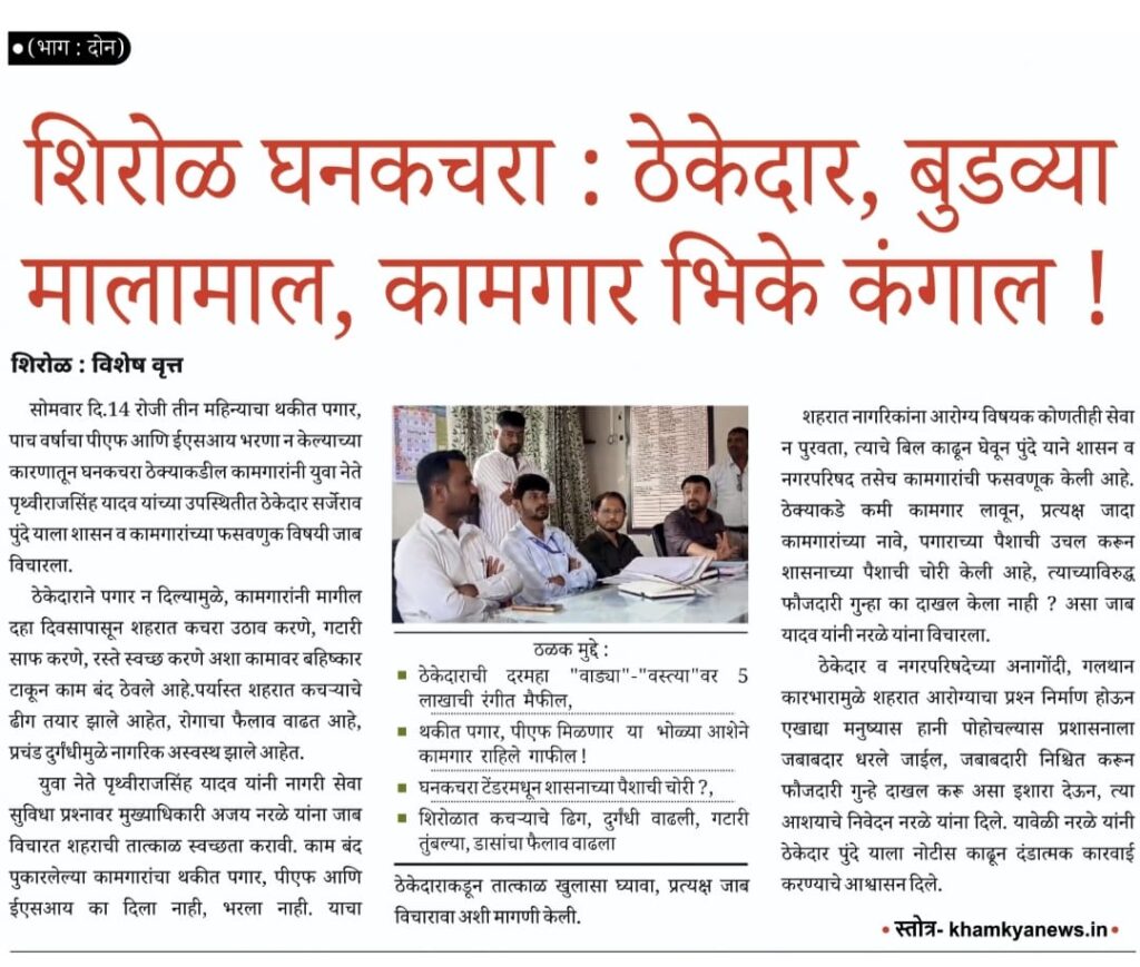 शिरोळ नगरपरिषदेच्या नगराध्यक्ष दालनात घनकचरा ठेक्याकडील कामगार, मुख्याधिकारी नरळे, इतर प्रशासकीय अधिकारी आणि पृथ्वीराजसिंह यादव व त्यांचे शिष्टमंडळ यांच्यात सोमवार दि.14 रोजी झालेल्या बैठकीदरम्यान, ठेकेदार पुंदे याने कामगार आणि नागरिकांची कशी फसवणूक केली, याचा उलगडा झाल्यानंतर पुरुष व महिला कामगारांनी ठेकेदार पुंदे याच्यावर थेट खालच्या भाषेत शाब्दिक हल्लाबोल केल्याची शहरात चर्चा आहे.