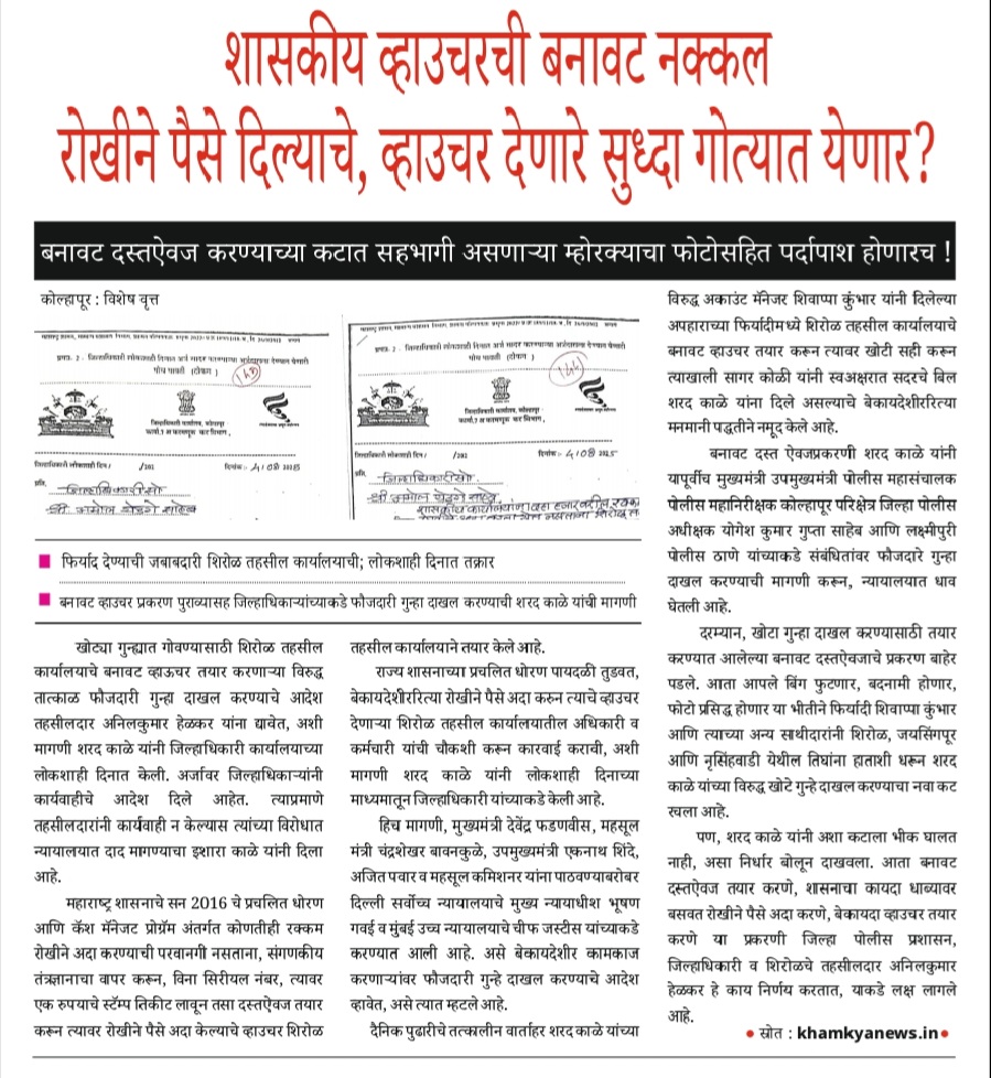 खोट्या गुन्ह्यात गोवण्यासाठी शिरोळ तहसील कार्यालयाचे बनावट व्हाऊचर तयार करणाऱ्या विरुद्ध तात्काळ फौजदारी गुन्हा दाखल करण्याचे आदेश तहसीलदार अनिलकुमार हेळकर यांना द्यावेत, अशी मागणी शरद काळे यांनी जिल्हाधिकारी कार्यालयाच्या लोकशाही दिनात केली. अर्जावर जिल्हाधिकाऱ्यांनी कार्यवाहीचे आदेश दिले आहेत. त्याप्रमाणे तहसीलदारांनी कार्यवाही न केल्यास त्यांच्या विरोधात न्यायालयात दाद मागण्याचा इशारा काळे यांनी दिला आहे.